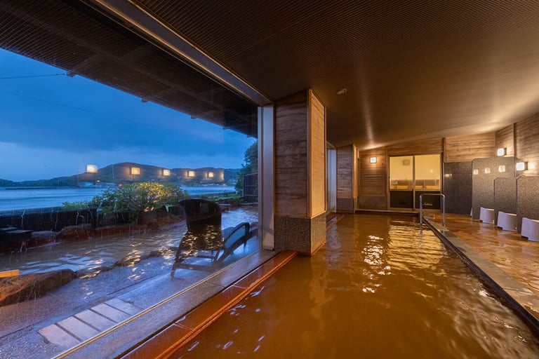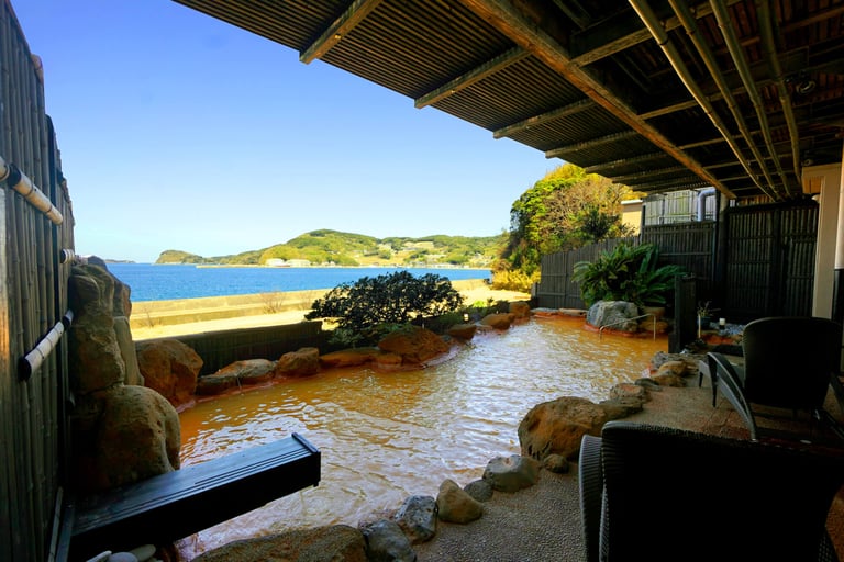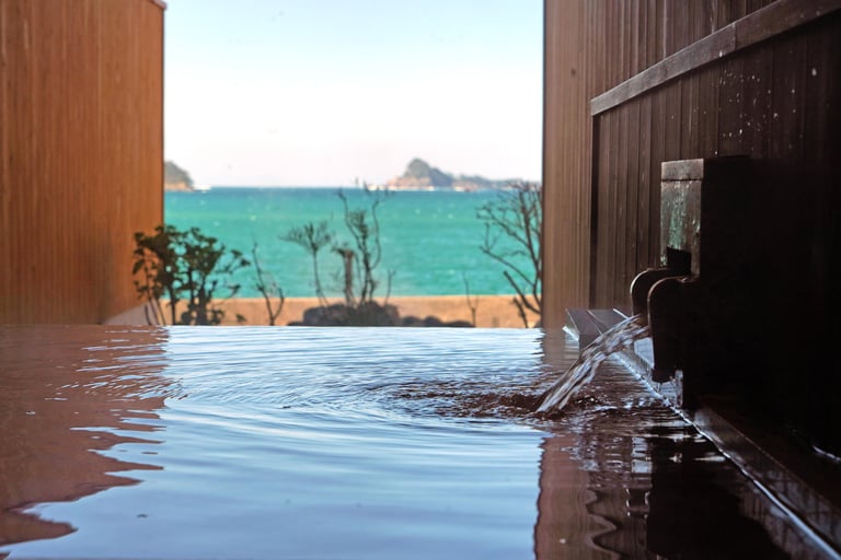 温泉は客室風呂以外にも貸切温泉も。空気に触れると金色に染まる超高濃度な天然温泉に浸かり、プライベート空間でオーシャンビューの絶景を満喫。