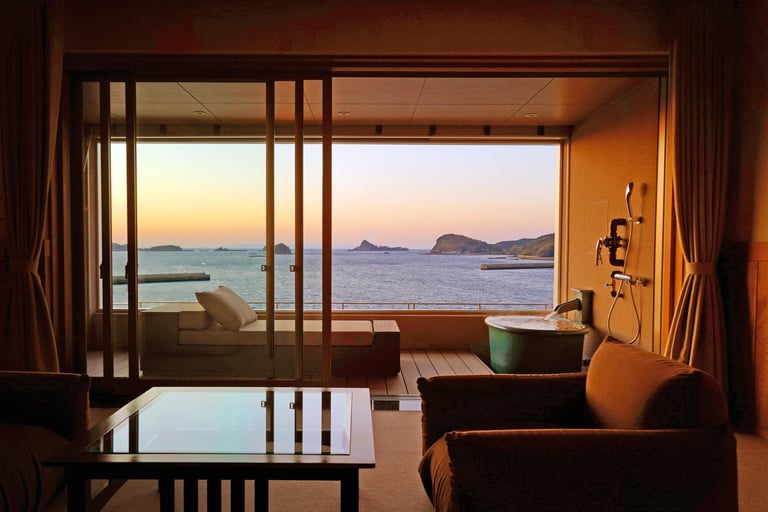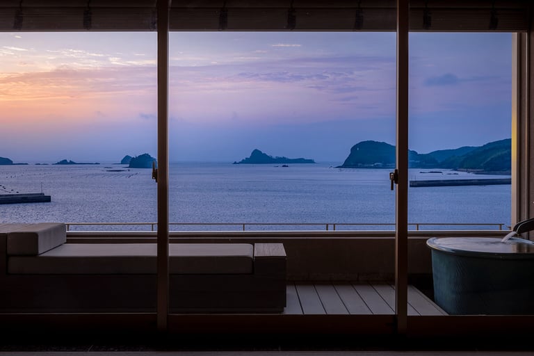 オーシャンビューの全客室は、源泉掛け流しの露天風呂が付く贅沢さ。スイートルームやプレミアム和洋室・和室など5タイプを用意。夕陽百選にも選ばれた”湯本湾”を眺められる、シンプルで心地良い空間です。