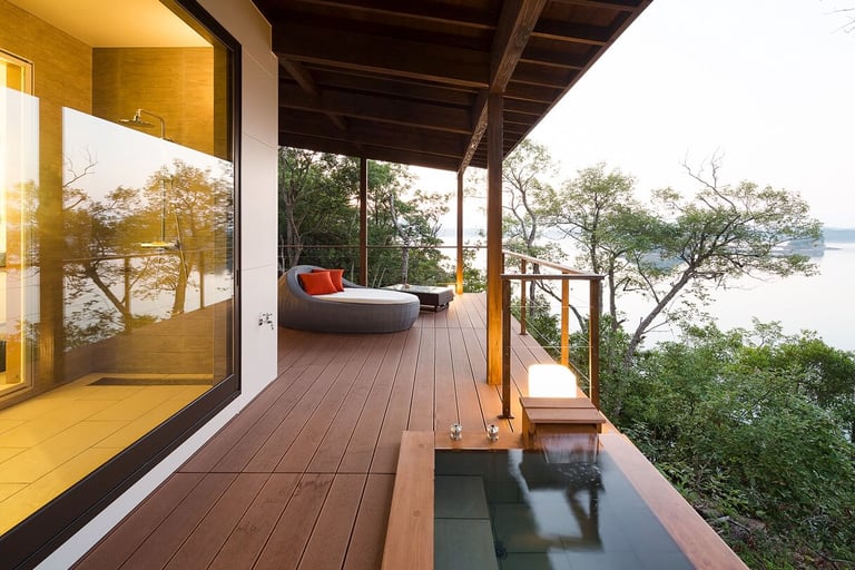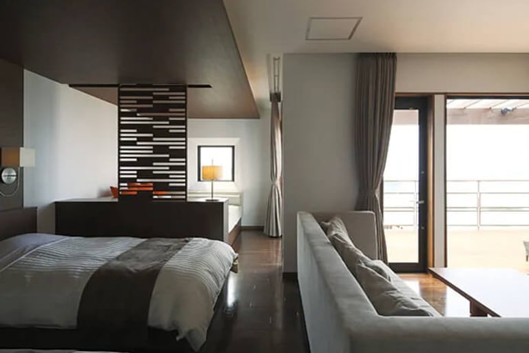 一戸建離れ”パノラマビューヴィラ”は、天草に浮かぶ約5,000坪の半島にわずか3棟という豪華さ。岬の最先端に立ち、視界を遮るものは何もない極上空間。美しい自然に囲まれ、海と空に癒やされる非日常のひと時を。