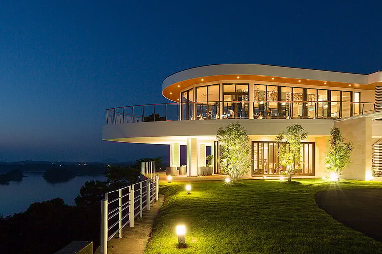 天空に浮かぶ豪華客船をイメージした母屋には絶景が広がるプールやテラスがあり、まるで海と空を船で旅するような気分に。夜はライトアップされた幻想的な雰囲気になり、一日中表情が変わる景色が楽しめます。