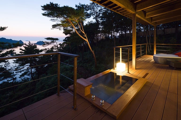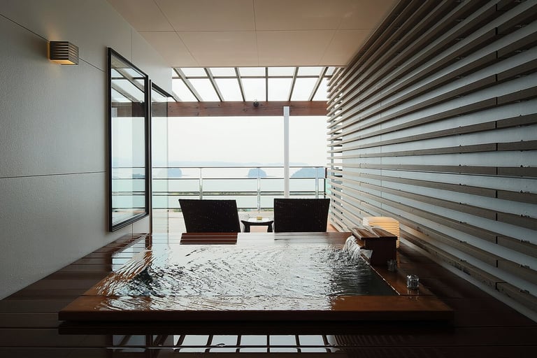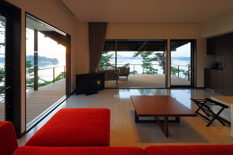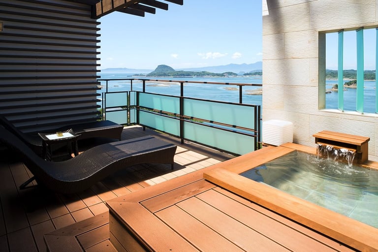 広々としたテラス付きの客室は、海と空との一体感が楽しめるオーシャンビュー。テラスには絶景の多島海・松島を望む天然温泉の露天風呂が。