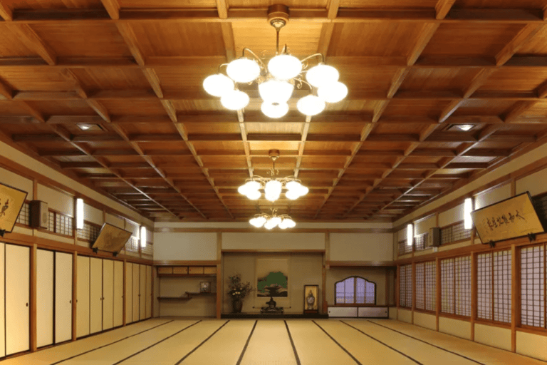 大広間の桐の柾目一枚板を使った格天井は、寺院などでも使われるスタイルで今では再現できない名建築としても人気です。