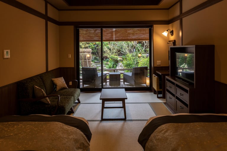 2021年に新設した、専用の庭に面した"新館・風の語り部"、桂川に面した半露天温泉風呂付き"別邸・水の語り部"は、どちらも畳敷きの室内に和ベッドが置かれ、ゆったりと過ごせます。