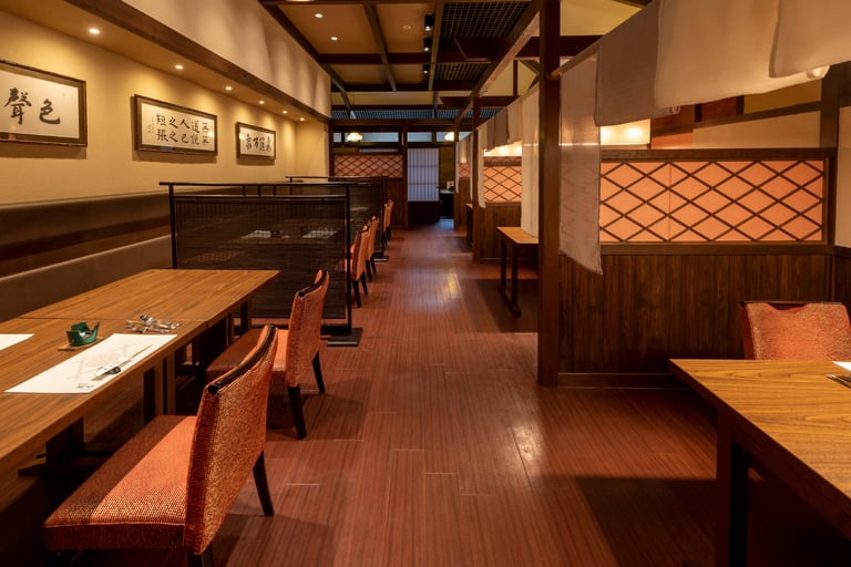 大きな窓からは、鯉の泳ぐ池や庭園を見渡せ、夜はライトアップされた幻想的な景色が広がります。