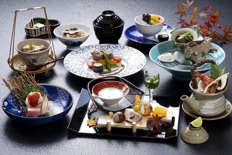 夕食は、季節の彩りを五感で味わう三養荘懐石料理🍽 地元食材をメニューに取り入れ、厳選素材を最大限に活かした調理法で提供。四季折々を感じさせる職人こだわりの一皿一皿でお腹も心も満たされます。