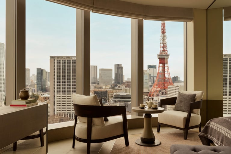 最大面積284㎡の広さを誇る“ジャヌスイート“は、2つのプライベートバルコニーやバーカウンター、ライブラリーのある書斎などを設えたレジデンシャルスタイル。エレガントなインテリアに囲まれ、目の前に東京タワーとスカイラインを望むラグジュアリーな空間です。2面にわたり東京の眺望が楽しめる“タワービュースイート“、ゆったりとした広さの“シティビュースイート“など、あたたかい自然光が差し込む開放感のある客室ばかり。都会の喧騒から離れ、非日常のひと時を。